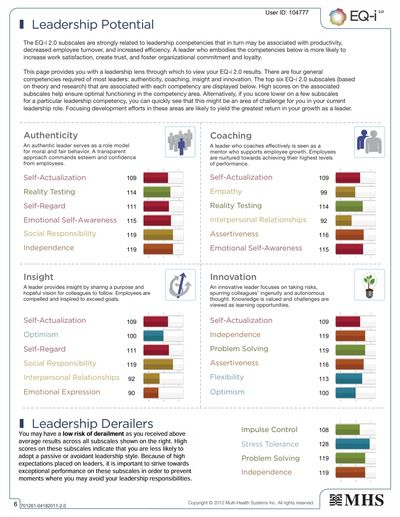 Examines EQ-i 2.0 results through four key dimensions of leadership: Authenticity, Coaching, Insight, and Innovation. As an option, your results can be compared against those of top leaders, creating a coaching benchmark for exceptional EI performance. The leadership report also contains insights on the leadership and organizational implications of your results, information about which skills have the highest potential to be leadership derailers, as well as strategies for development aimed to help you reach your true leadership potential.
